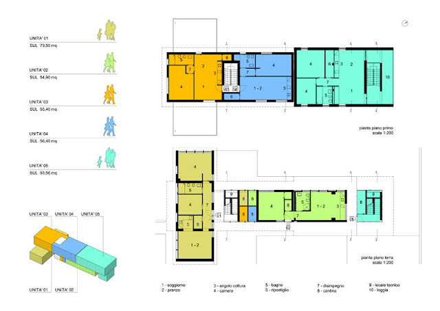 Le cinque unità sono costituite da bilocali e trilocali e i nuovi volumi accessori sono inseriti in una posizione che agevola la distribuzione interna offrendo a tutte le unità immobiliari il doppio affaccio.